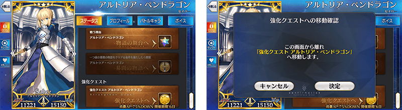 サーヴァント詳細画面から各サーヴァントの「幕間の物語」「サーヴァント強化クエスト」に移動できる機能を追加いたします。