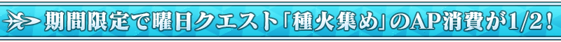 期間限定で、カルデアゲート内に曜日ごとに出現するクエスト「種火集め」のAP消費量が1/2となります!