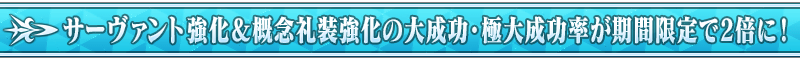 サーヴァントおよび概念礼装の強化をおこなった際に、大成功(経験値2倍ボーナス)・極大成功(経験値3倍ボーナス)の発生率が期間限定で2倍になります!
