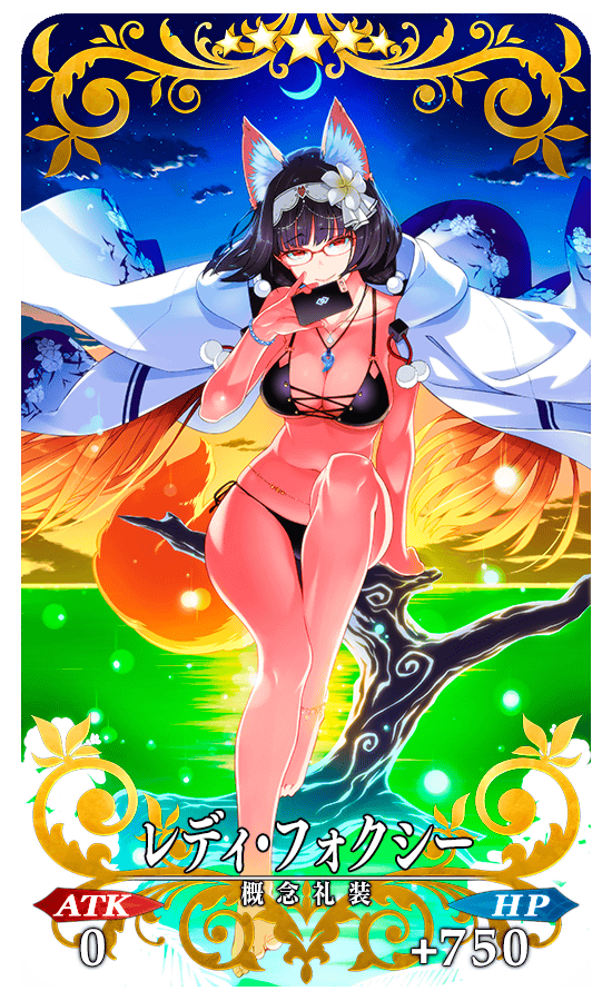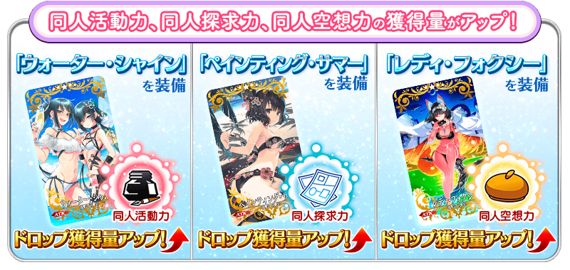 イベントアイテム交換にて入手できるイベント限定の概念礼装「ウォーター・シャイン」「ペインティング・サマー」「レディ・フォクシー」を装備することで、期間限定イベント「サーヴァント・サマー・フェスティバル!」における、同人活動力、同人探求力、同人空想力の獲得量がアップします。