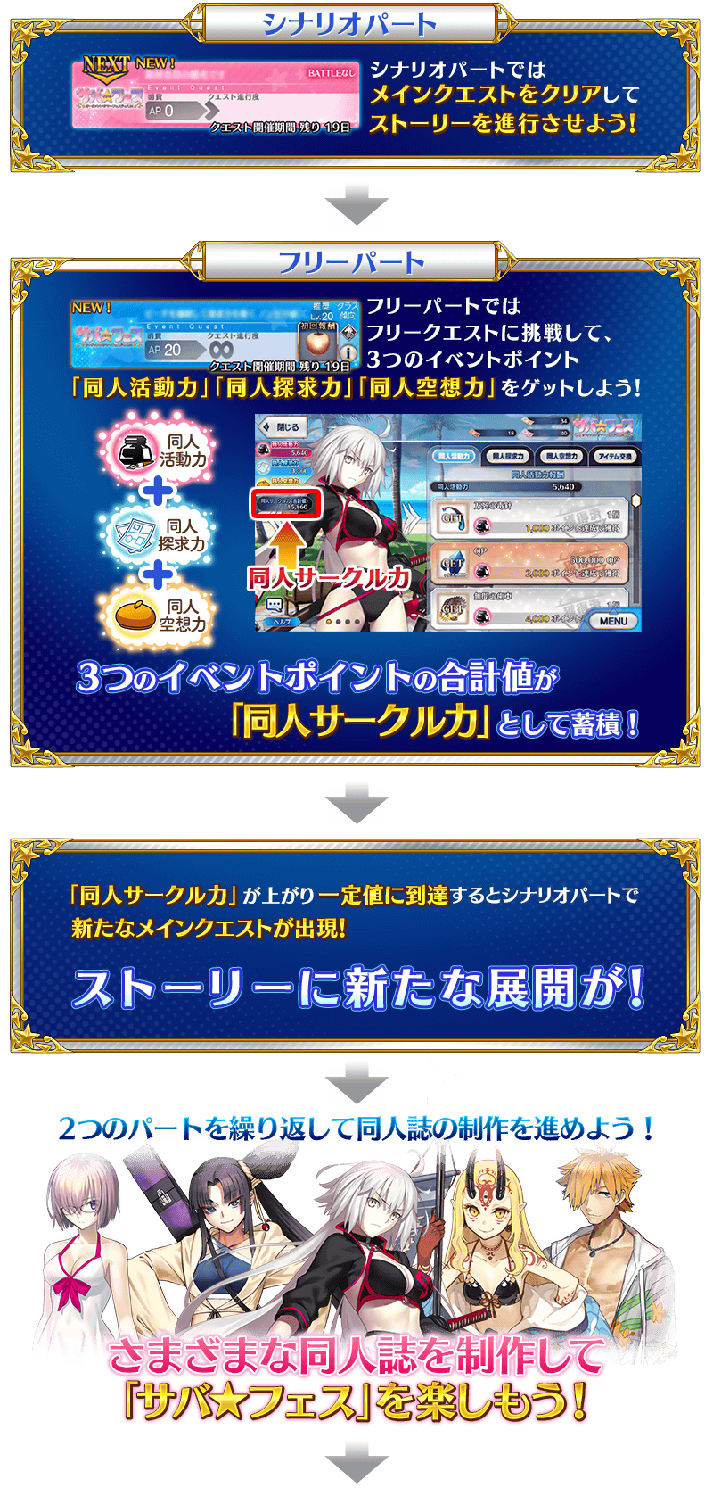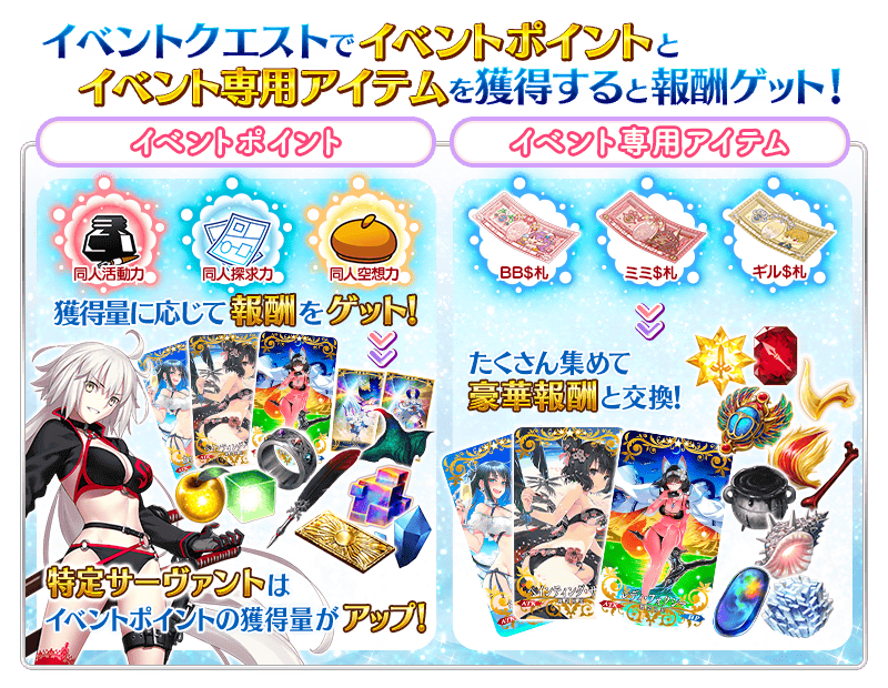 期間限定イベント「サーヴァント・サマー・フェスティバル!」より新たに登場したサーヴァントは、他の対象サーヴァントよりも3つの各イベントポイント(同人活動力、同人探求力、同人空想力)の獲得量が多くなります。