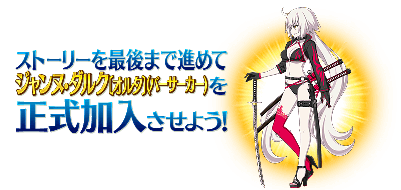 本イベントではメインクエストを進行すると、イベント限定サーヴァント「★4(SR)ジャンヌ・ダルク〔オルタ〕(バーサーカー)」が期間限定加入いたします。