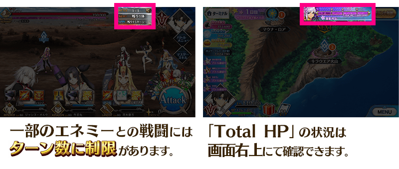 バトルは、「通常のHPを0にする」「制限ターン数の経過」「バトルに敗北」のいずれかで終了し、最終的に「Total HP」を0にすればエネミーを倒せます。