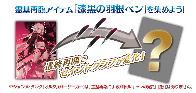 イベント期間中、「イベントアイテム交換」や「イベントポイント報酬」で手に入る「漆黒の羽根ペン」を使って、霊基再臨を4回繰り返すと、セイントグラフに変化が!