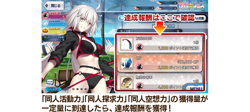 「同人活動力」「同人探求力」「同人空想力」の獲得量が一定量に到達すると、獲得量に応じた達成報酬を獲得できます。