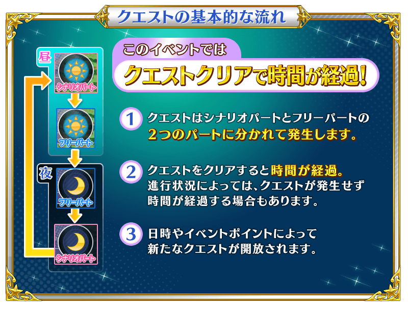 3種の指令紋章(コマンドコード)とその関連アイテムが報酬となるクエストは、3つの各イベントポイント(同人活動力、同人探求力、同人空想力)を溜めていくことで出現しますので、ぜひこの機会にゲットしましょう!
