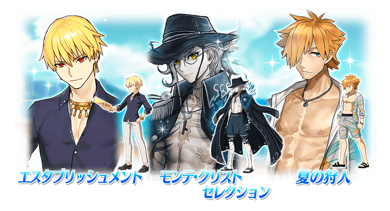 期間限定イベント「サーヴァント・サマー・フェスティバル!」のクエスト報酬として、「★5(SSR)巌窟王 エドモン・ダンテス」「★4(SR)ギルガメッシュ(キャスター)」「★3(R)ロビンフッド」の霊衣開放権が登場!