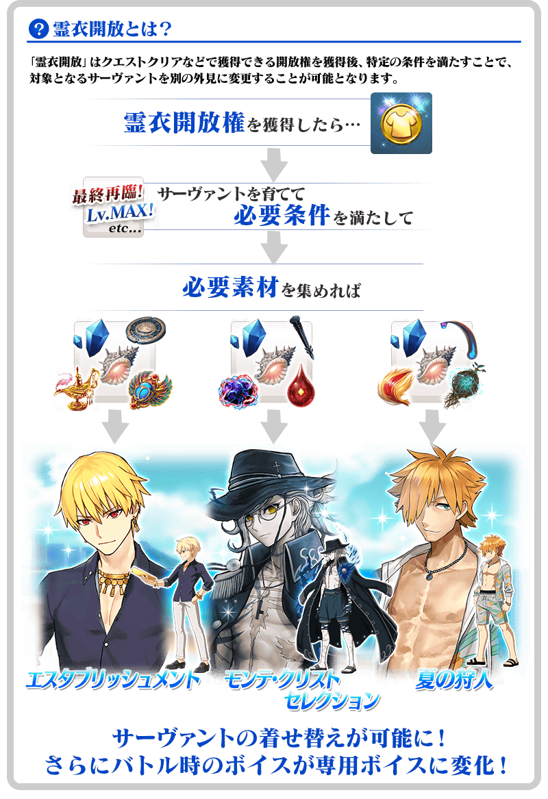 ※「霊衣開放」による変更はサーヴァントの外見やボイスのみでクラスやパラメータなどに変化はありません。