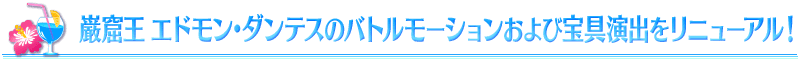 「★5(SSR)巌窟王 エドモン・ダンテス」のバトルモーションおよび宝具演出をリニューアルいたします! また、「Fate/Grand Order」公式サイト内のお知らせにて、「★5(SSR)巌窟王 エドモン・ダンテス」の宝具演出を公開しております。あわせてご確認ください。