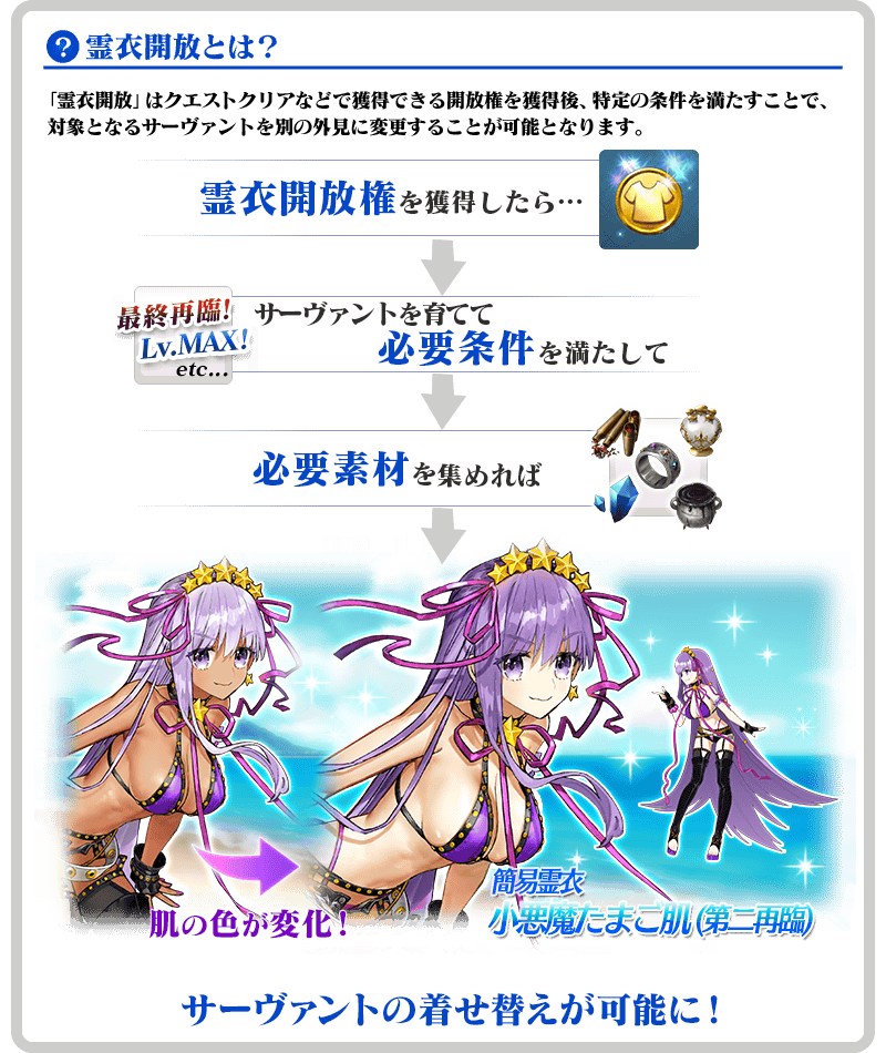 ※「霊衣開放」による変更はサーヴァントの外見のみでクラスやパラメータなどに変化はありません。