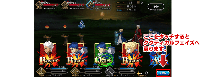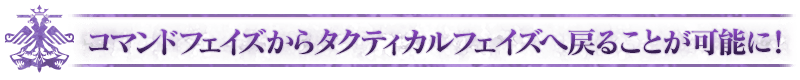 コマンドフェイズ画面へ移行後、画面右下に表示されている「戻る」ボタンをタッチすることで、タクティカルフェイズ画面へと戻ることができるようになります。
