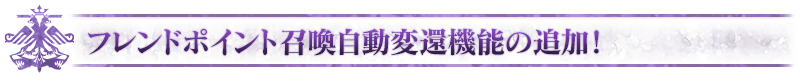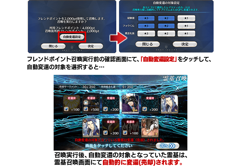 フレンドポイント召喚にて排出された「経験値」「フォウくん」「概念礼装」を、あらかじめ「自動変還設定」をしておくことで、召喚実行後の霊基召喚画面で自動的にマナプリズムまたはQPに変還(売却)する機能を追加いたします。