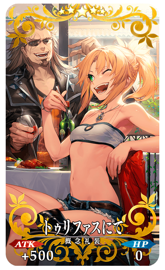 「ドラクルコイン」の獲得報酬で入手できるイベント限定の概念礼装「トゥリファスにて」を装備することで、期間限定イベント「Apocrypha/Inheritance of Glory」のイベントクエストにおける自身の攻撃の威力がアップします。