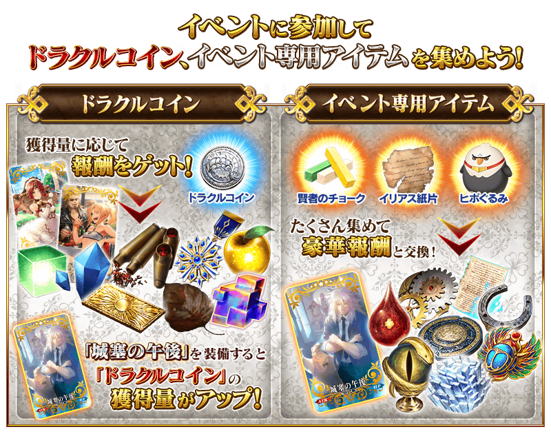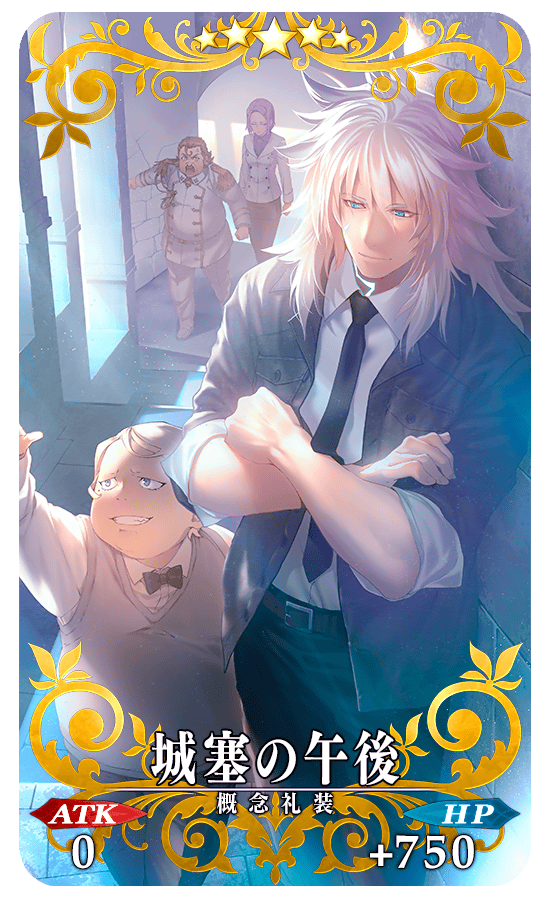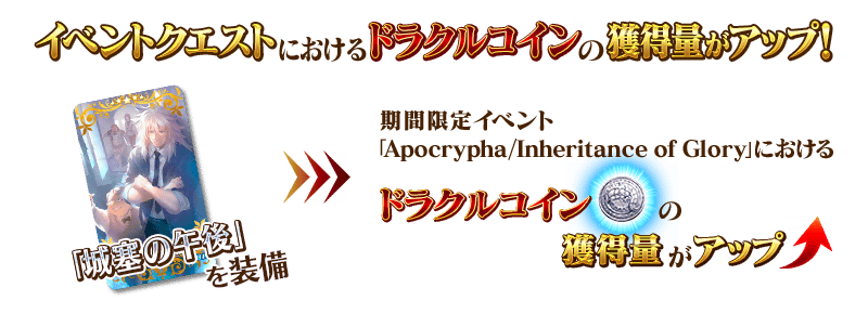 イベントアイテム交換で入手できるイベント限定の概念礼装「城塞の午後」を装備することで、期間限定イベント「Apocrypha/Inheritance of Glory」のイベントクエストにおける「ドラクルコイン」の獲得量がアップします。
