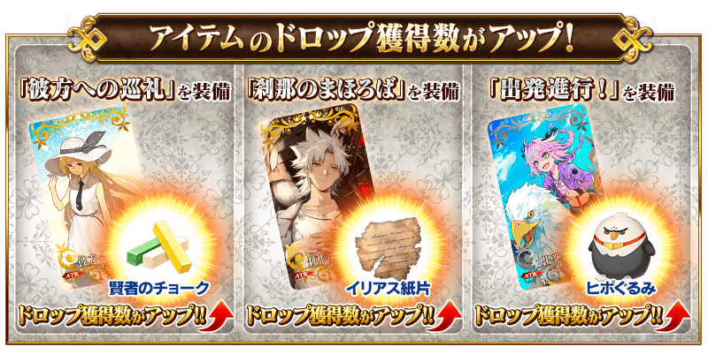 聖晶石召喚にてピックアップされる期間限定概念礼装「彼方への巡礼」「刹那のまほろば」「出発進行!」を装備することで、期間限定イベント「Apocrypha/Inheritance of Glory」におけるイベント専用アイテム「賢者のチョーク」「イリアス紙片」「ヒポぐるみ」のドロップ獲得数がアップします。