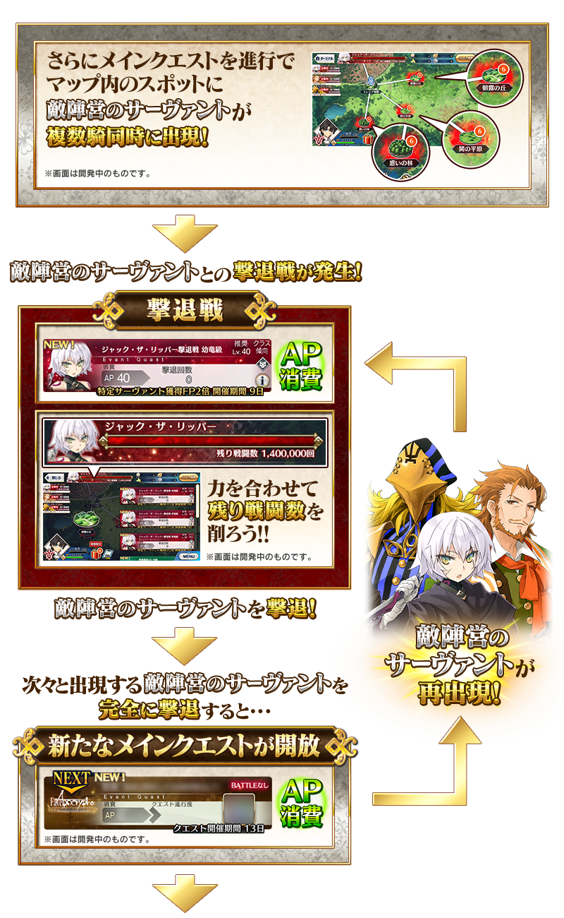 本イベントではメインクエストを進行すると、敵陣営のサーヴァントが立て続けに複数登場する撃退戦が発生いたします。