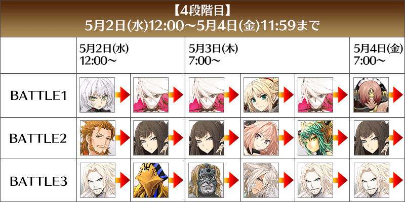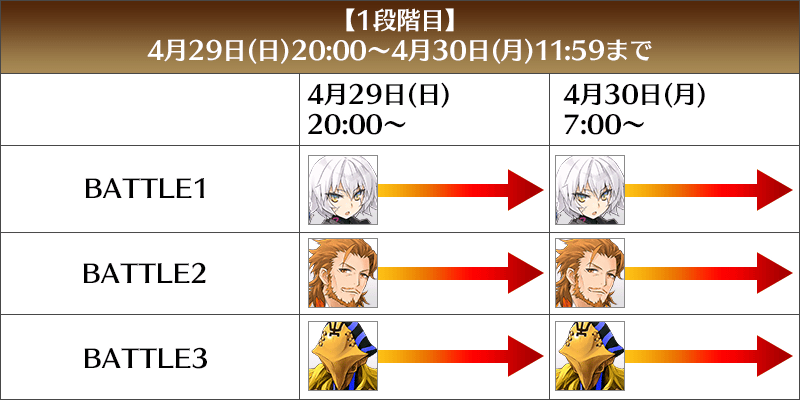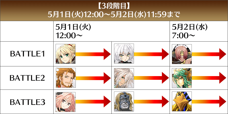 敵陣営のサーヴァントが複数同時に出現する撃退戦は、4月29日(日) 20:00より開始し、5月6日(日)までの間に全部で5段階発生いたします。