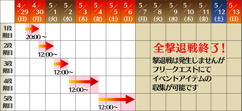 撃退戦は4月29日(日) 20:00より開始し5月6日(日)までの間に、5段階に分けて発生いたします。