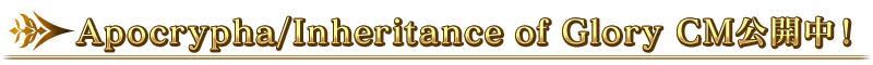 Fate/Grand Order公式サイト内トップページおよびギャラリーにて、期間限定Fate/Apocrypha×Fate/Grand Orderスペシャルイベント「Apocrypha/Inheritance of Glory」のTVCMを公開しております。あわせてご確認ください。