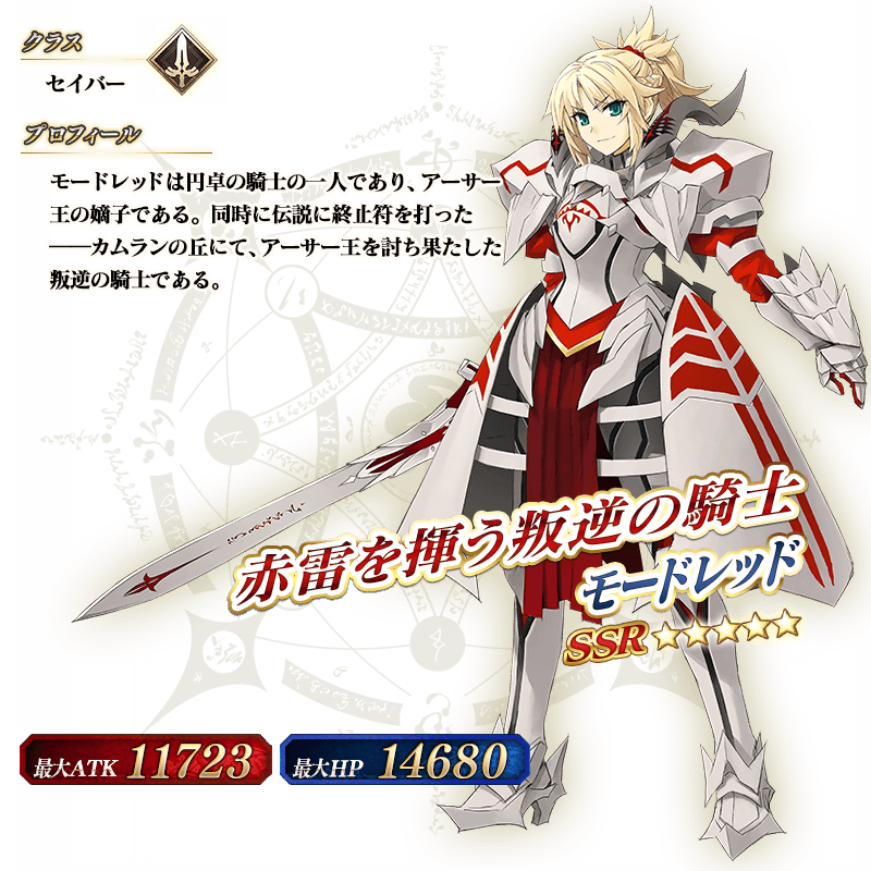 また、「Fate/Grand Order」公式サイト内のお知らせにて、「★5(SSR)モードレッド(セイバー)」の宝具演出を公開しております。あわせてご確認ください。