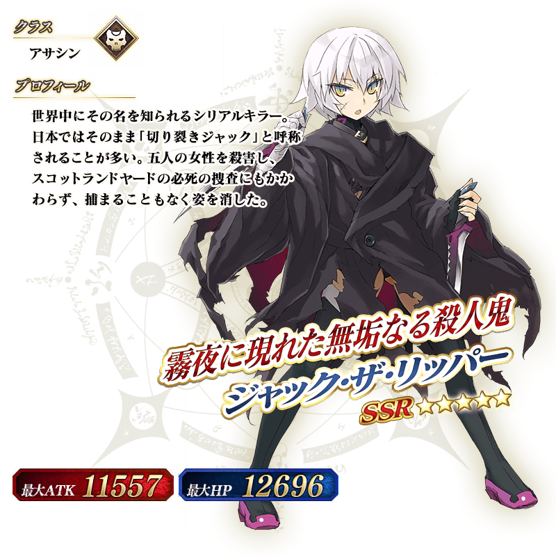 ※モードレッド(セイバー)、カルナ、ジャック・ザ・リッパー、ヴラド三世(バーサーカー)、ジャンヌ・ダルク(ルーラー)、ジークフリート、アタランテ(アーチャー)、アストルフォ、フランケンシュタイン(バーサーカー)はピックアップ期間終了後もストーリー召喚にて排出されます。