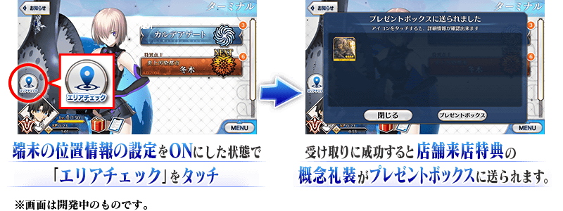 通信の状態が不安定な場合や、位置情報の設定がOFFに設定されている場合は、「店舗来店特典」の概念礼装が上手く入手できない場合がございます。
