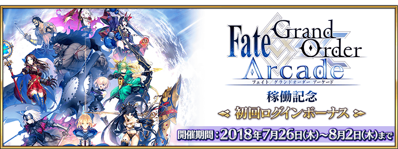 「Fate/Grand Order Arcade」稼働記念初回ログインボーナスの詳細については下記バナーよりご確認ください。