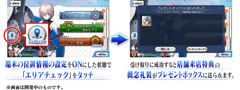 通信の状態が不安定な場合や、位置情報の設定がOFFに設定されている場合は、「店舗来店特典」の概念礼装が上手く入手できない場合がございます。