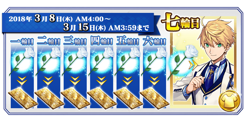 | 七輪目 | 3月14日(水) AM4:00~ 3月15日(木) AM3:59 | ★5(SSR)アーサー・ペンドラゴン〔プロトタイプ〕霊衣「ホワイトローズ」開放権 | |