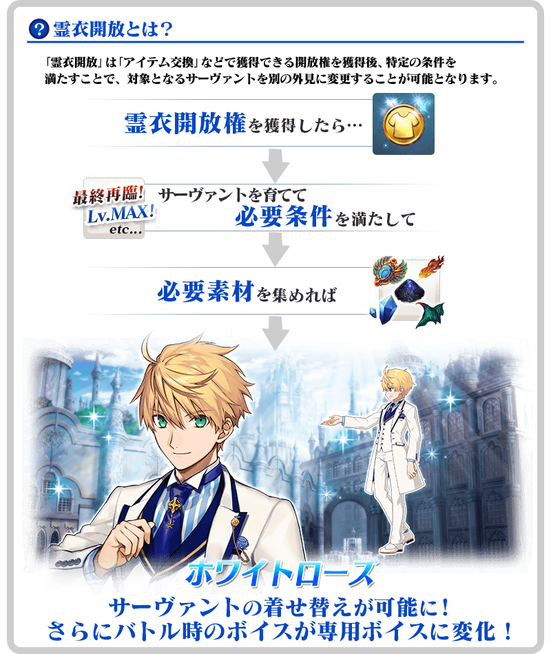 ※「霊衣開放」による変更はサーヴァントの外見やボイスのみでクラスやパラメータなどに変化はありません。