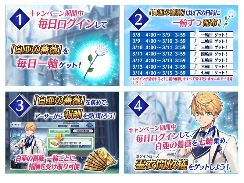 ※各ログイン日時の期間内でログインできなかった場合には「白亜の薔薇」を受け取ることができませんのでご注意ください。