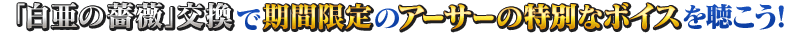 ※「白亜の薔薇」と報酬の交換時に聴くことのできるアーサー・ペンドラゴン〔プロトタイプ〕の特別なボイスは、キャンペーン期間終了後、サーヴァント詳細の「ボイスリスト」に追加されます。