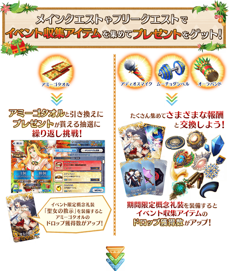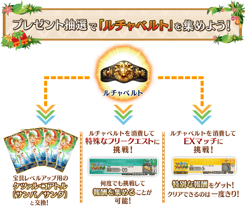 ※プレゼントラインナップにあるイベント収集アイテム「ルチャベルト」はケツァル・コアトル〔サンバ/サンタ〕【宝具強化用】や素材と交換できるほか、集めることで特殊なフリークエストを実行できます。