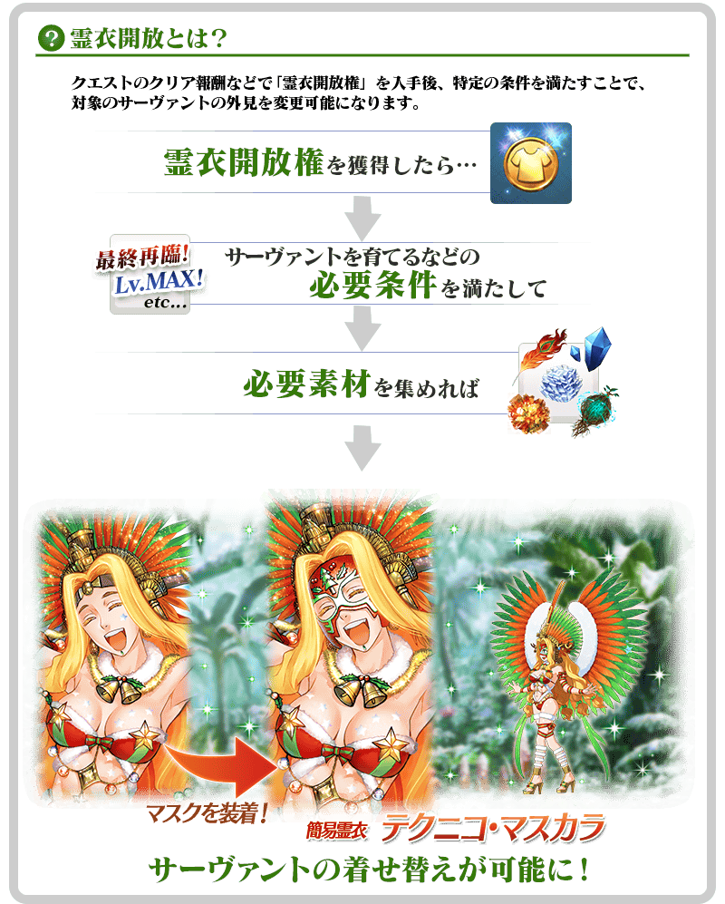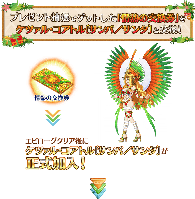 なお、ケツァル・コアトル〔サンバ/サンタ〕の霊衣開放権は、「クリスマス2018 ホーリー・サンバ・ナイト ~雪降る遺跡と少女騎士~」交換期間を過ぎると入手できなくなるのでご注意ください。