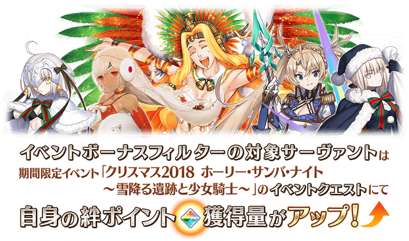 本イベントの期間中、イベントボーナスフィルターの対象サーヴァントは、イベントクエストでの自身の絆ポイント獲得量がアップします!