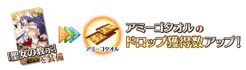 イベントアイテム交換にて入手できるイベント限定概念礼装「聖女の教示」を装備することで、「アミーゴタオル」のドロップ獲得数がアップします。