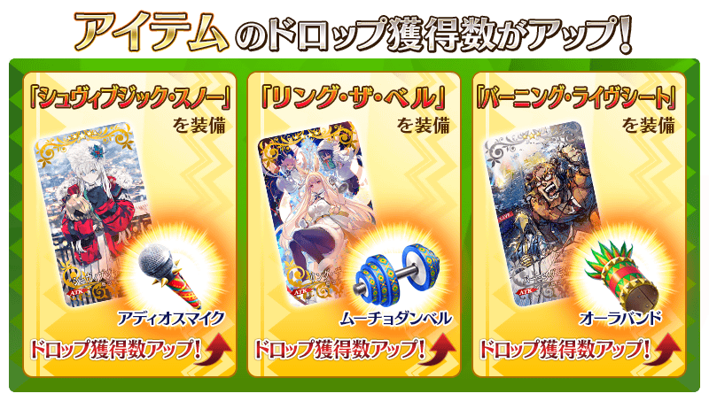 聖晶石召喚にてピックアップされる期間限定概念礼装「シュヴィブジック・スノー」「リング・ザ・ベル」「バーニング・ライヴシート」を装備することで、イベント収集アイテム「アディオスマイク」「ムーチョダンベル」「オーラバンド」それぞれのドロップ獲得数がアップします。