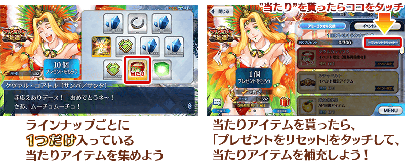プレゼントのラインナップごとに当たりアイテムが1つ入っています。