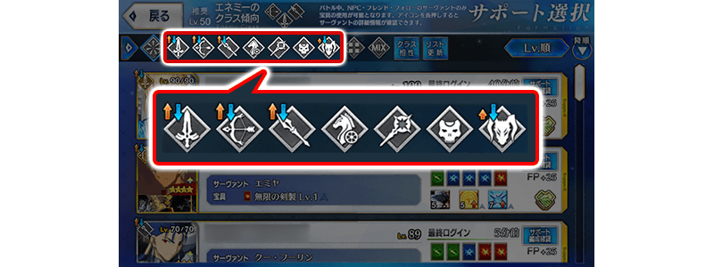 サポート選択画面のクラスを切り替えるボタンにクラス相性がわかる表示を追加いたします。