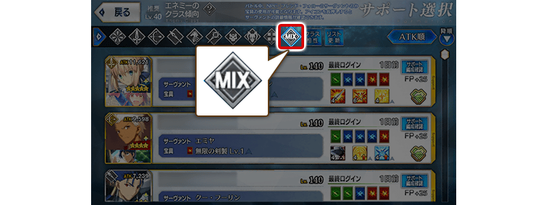 「MIX」ボタンを選択することで、サポート枠をまたいですべてのサポートを一覧表示できるようになります。