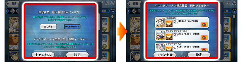 イベントクエストで使用できるイベントボーナスフィルターに、最大解放済みの概念礼装を装備しているサポートのみ表示する機能を追加いたします。