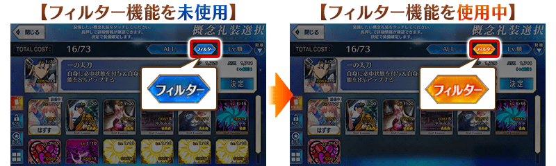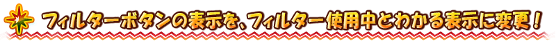 サーヴァント選択画面等でフィルター機能を使用している際に、フィルターボタンの色が変わるように改修いたします。