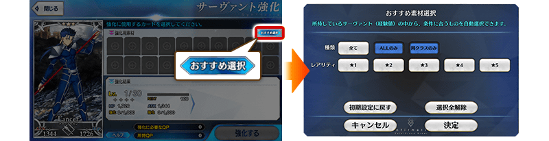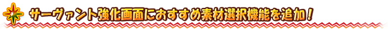 サーヴァント強化で強化素材を選択する際に、事前に設定した条件の中から強化に使用できる素材を自動選択する機能を追加いたします。