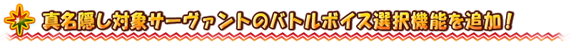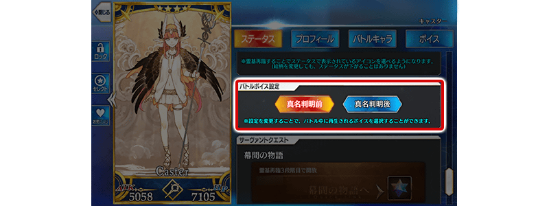 サーヴァントの真名が判明した後に、バトルボイスが真名判明後ボイスに固定されておりましたが、判明前と判明後でバトルボイスを選択できるようにいたします。
