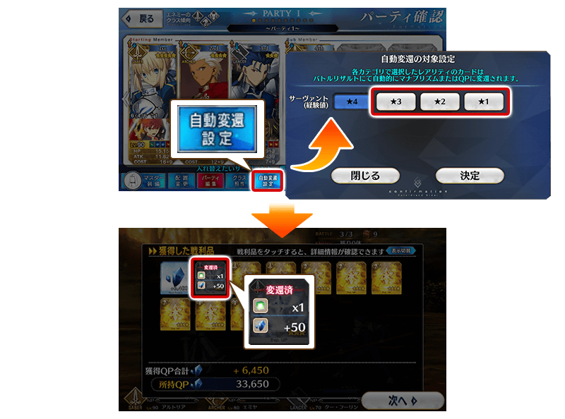 自動変還する経験値カードのレアリティは、クエスト実行時のパーティ確認画面から設定できます。