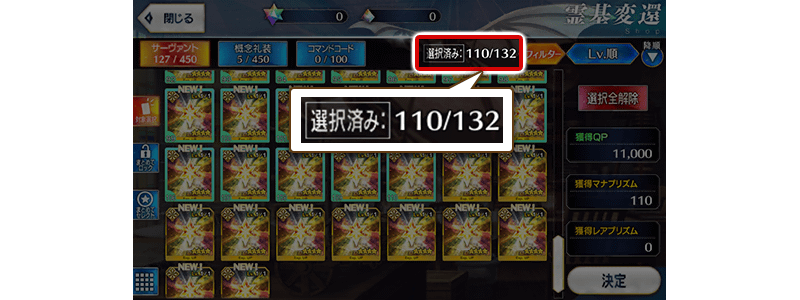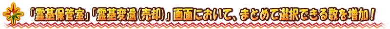 「霊基保管室」「霊基変還(売却)」画面で、選択できる数を各画面の最大数まで増加いたします。