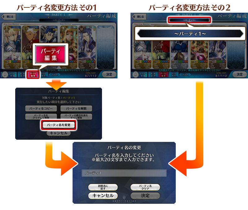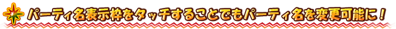 パーティ編成、クエスト実行時のパーティ確認、サポート編成の各画面において、パーティ名の表示枠をタッチすることでもパーティ名を変更可能になります。
