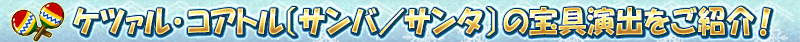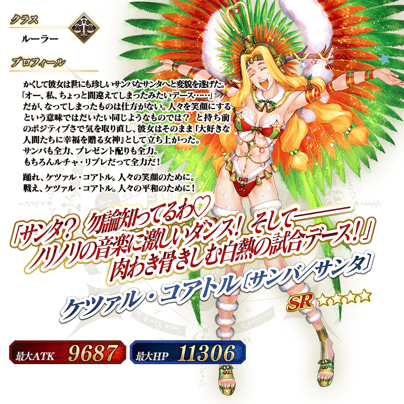 「Fate/Grand Order」公式サイト内のお知らせにて「★4(SR)ケツァル・コアトル〔サンバ/サンタ〕」の宝具演出を公開しております。あわせてご確認ください。