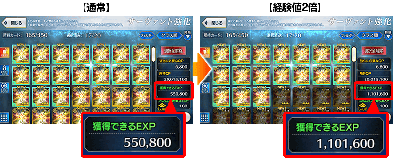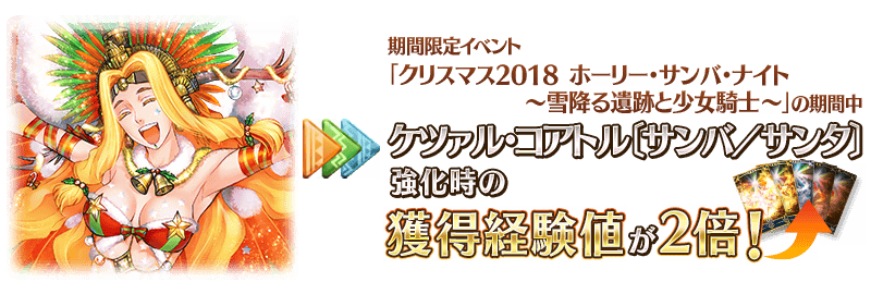 本イベントの期間中は、「★4(SR)ケツァル・コアトル〔サンバ/サンタ〕(ルーラー)」を強化した際の獲得経験値が2倍になります。