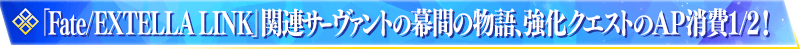 下記の期間中、「Fate/EXTELLA LINK」に関連する一部サーヴァントを対象に、幕間の物語および強化クエストのAP消費量が1/2となります。